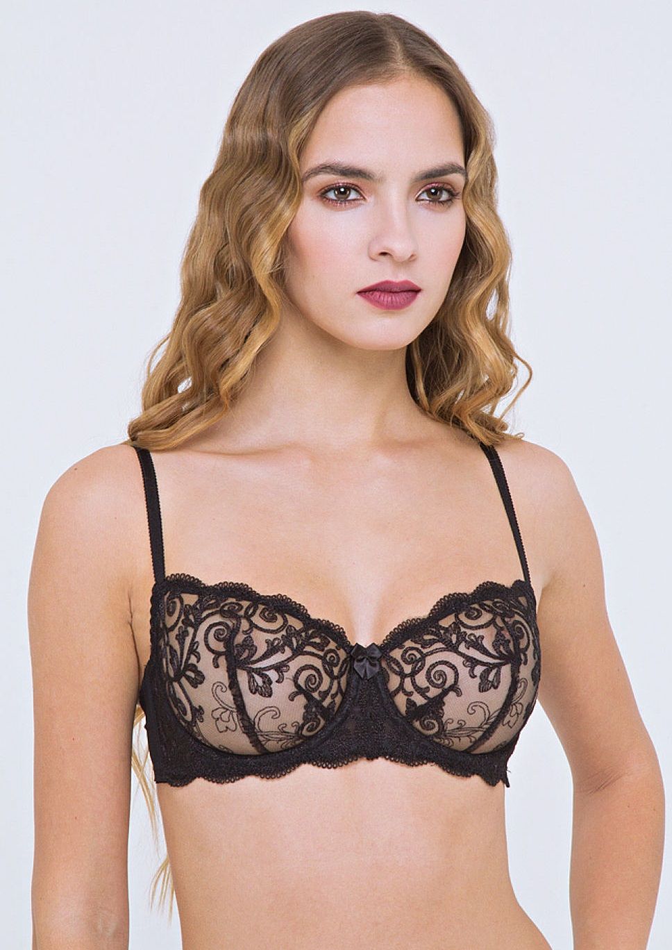 Модель с легкими, полупрозрачными чашками из изысканного шитья по ажурной сетке. Благодаря оригинальному крою чашек с двумя разнонаправленными вытачками бюстгальтер создаёт идеальную округлую форму груди.